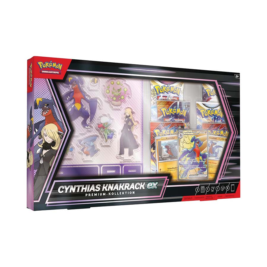 Cynthia und Knakrack liefern die Stärke eines Champs! Cynthia ist als Champ der Sinnoh-Region eine der stärksten Pokémon-Trainerinnen der Welt und Knakrack ist seit Anbeginn an ihrer Seite! Entdecke in dieser Kollektion die Kraft ihrer Freundschaft mit einer holografischen Promokarte mit Cynthias Knakrack-ex, dessen Attacken großen Schaden anrichten und dir helfen, Karten zu ziehen. Außerdem erhältst du holografische Karten mit Cynthias Kaumalat und Cynthias Knarksel, einen tollen Sticker und Aufsteller zum Ausstellen sowie noch mehr Pokémon in Boosterpacks. Nicht zu verachten ist, dass der Aufsteller mehr von Cynthias ikonischen Pokémon zeigt, die auch in Karmesin & Purpur – Ewige Rivalen aufzufinden sind!